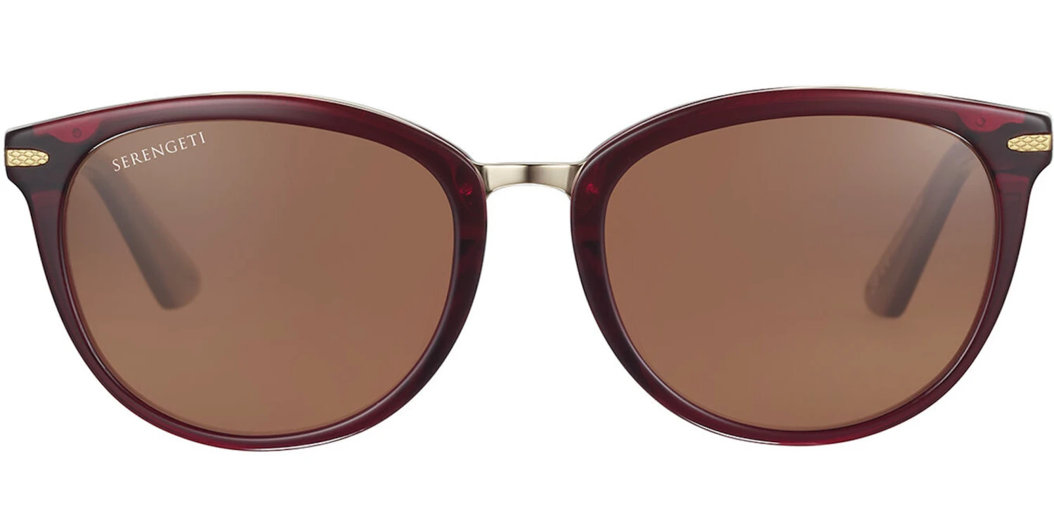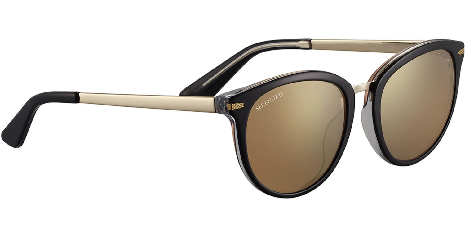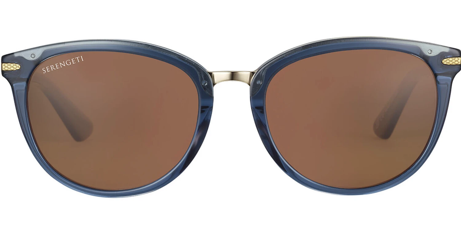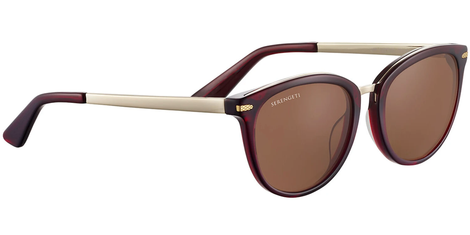 Jodie, the innovative cat-eye shape. Innovation and Serengeti go hand in hand, and Jodie is another perfect example of this. The “sandwich” construction with the metal shadowing at the top, surrounded by eco-friendly acetate adds exquisite detail and a touch of modernity to this classic, glamourous frame. The metal temples and the Serengeti mineral lenses complete this butterfly design.